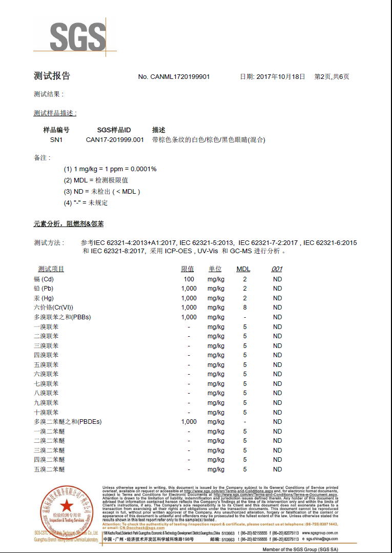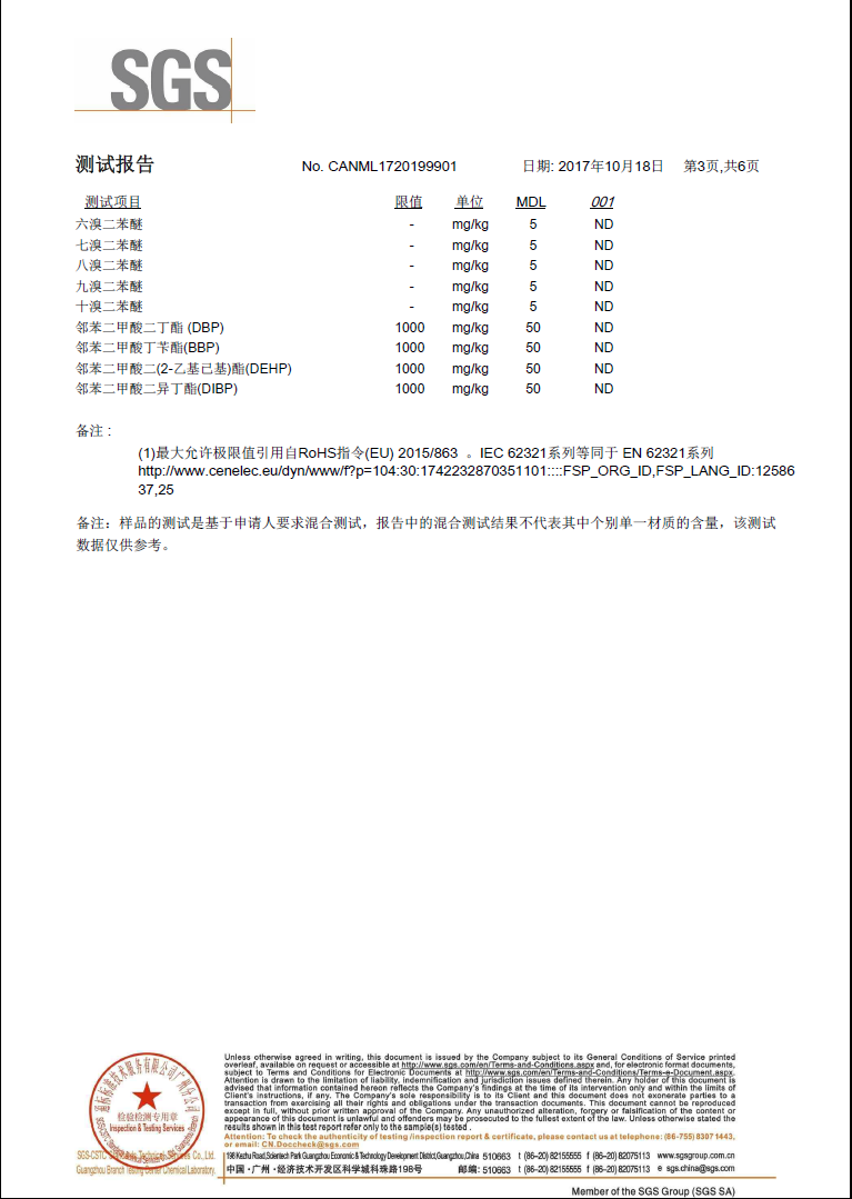 測試結果顯示為“0”,不存在,詳請見SGS檢測報告。(檢測證書編號:NO. CANML1720199901)